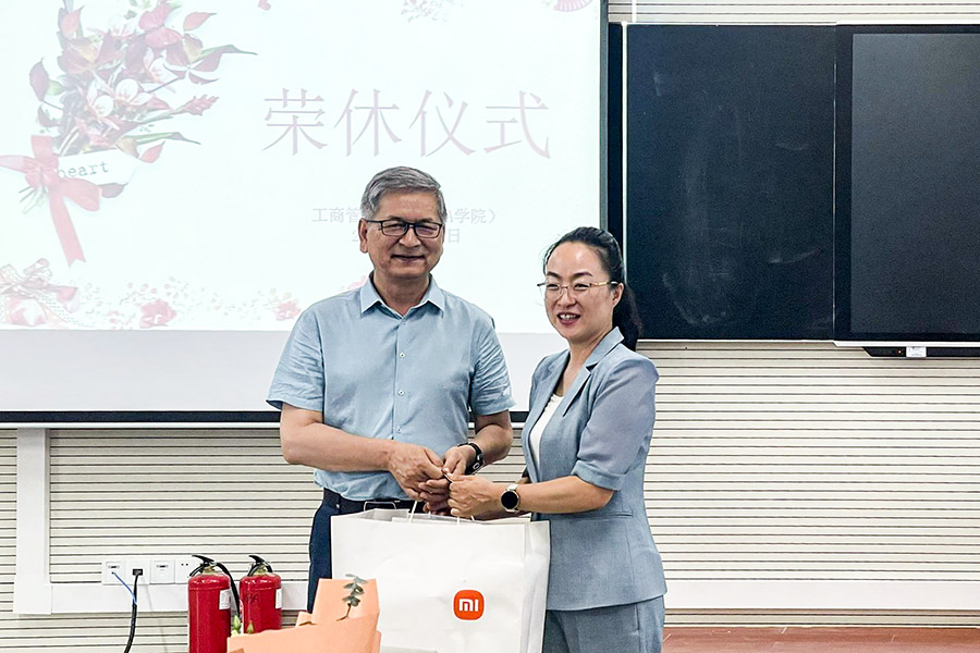 仪式第四项,王海芳院长代表学院向两位退休教师赠送退休礼品并感谢两位教师将自己最美的时光奉献给了教育事业,数十年如一日在自己的岗位上兢兢业业,育满园桃李芬芳。王海芳院长表示学院的发展离不开一代代教师的付出与传承,祝愿两位教师身体健康,退而不休乐其中,开启人生新篇章。